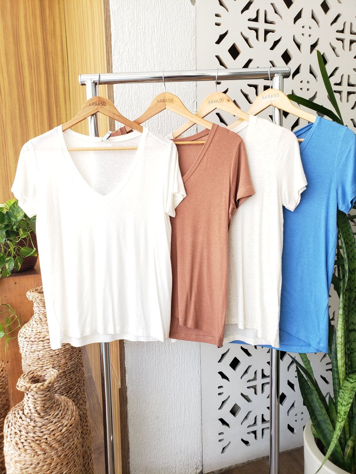 Blusa em malha, manga curta, decote em V.