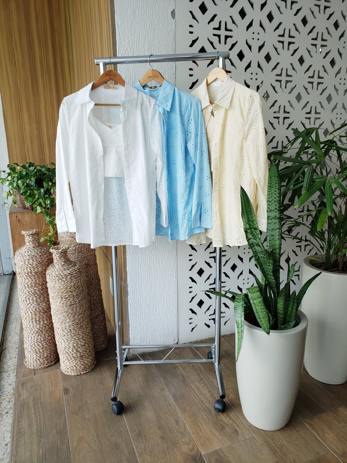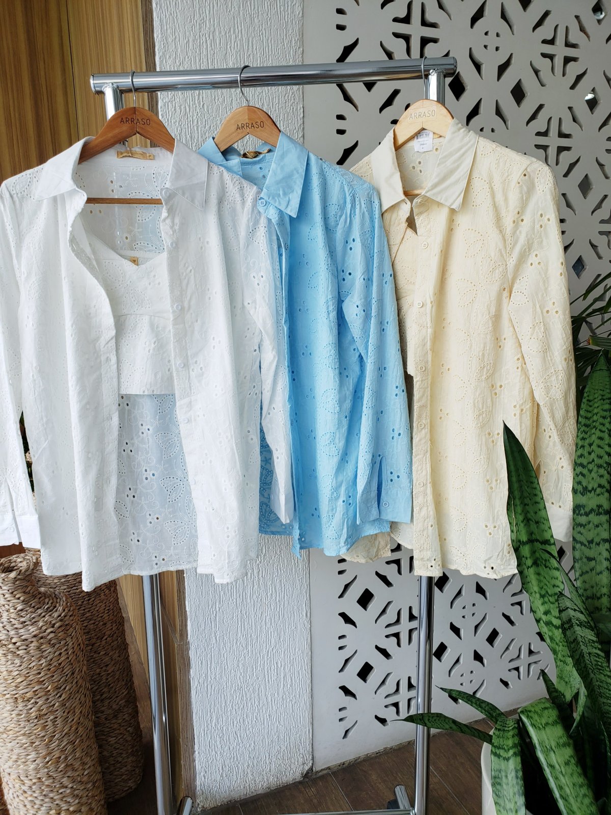Conjunto de camisa e cropped em laise, elástico atrás.