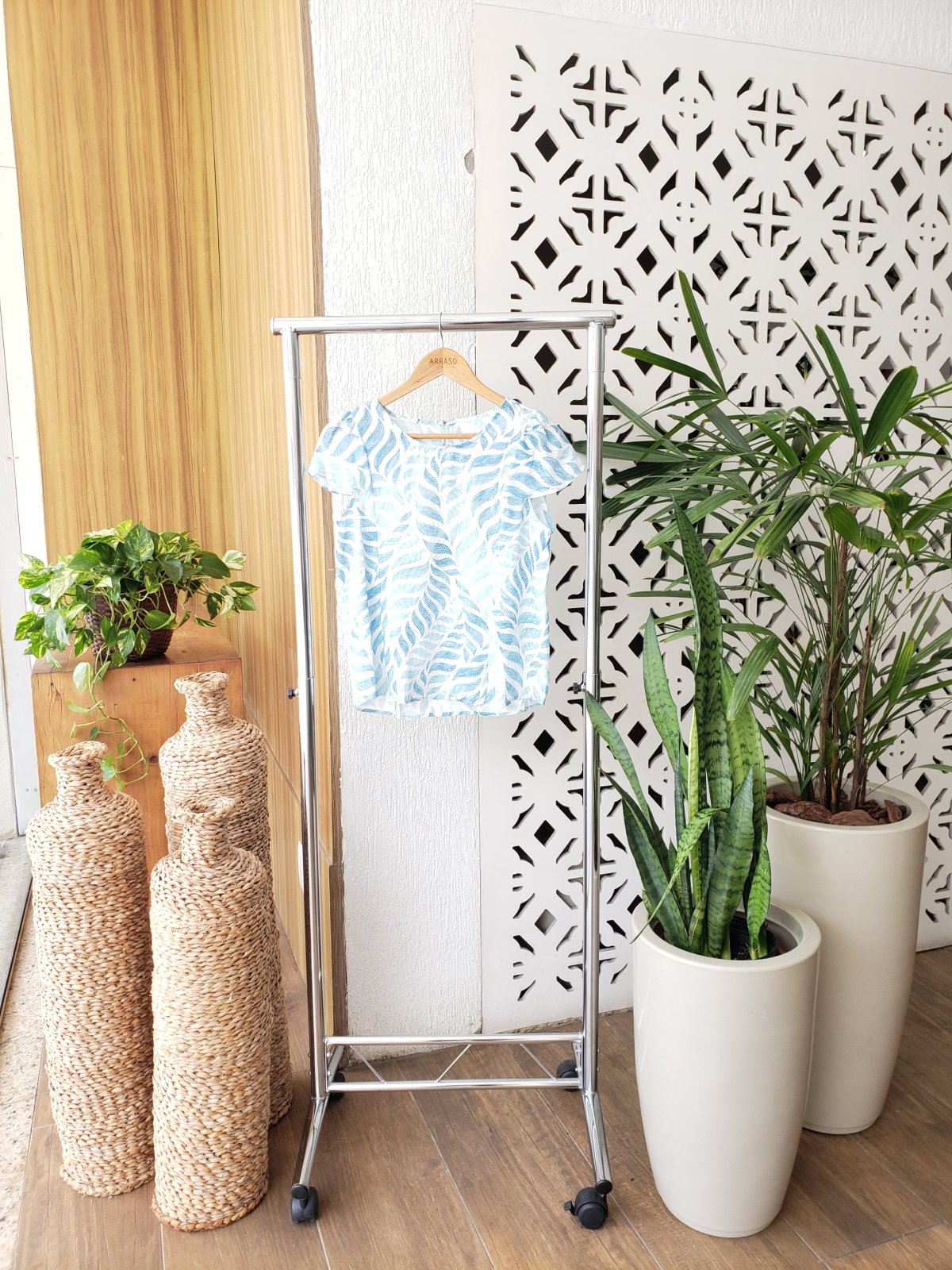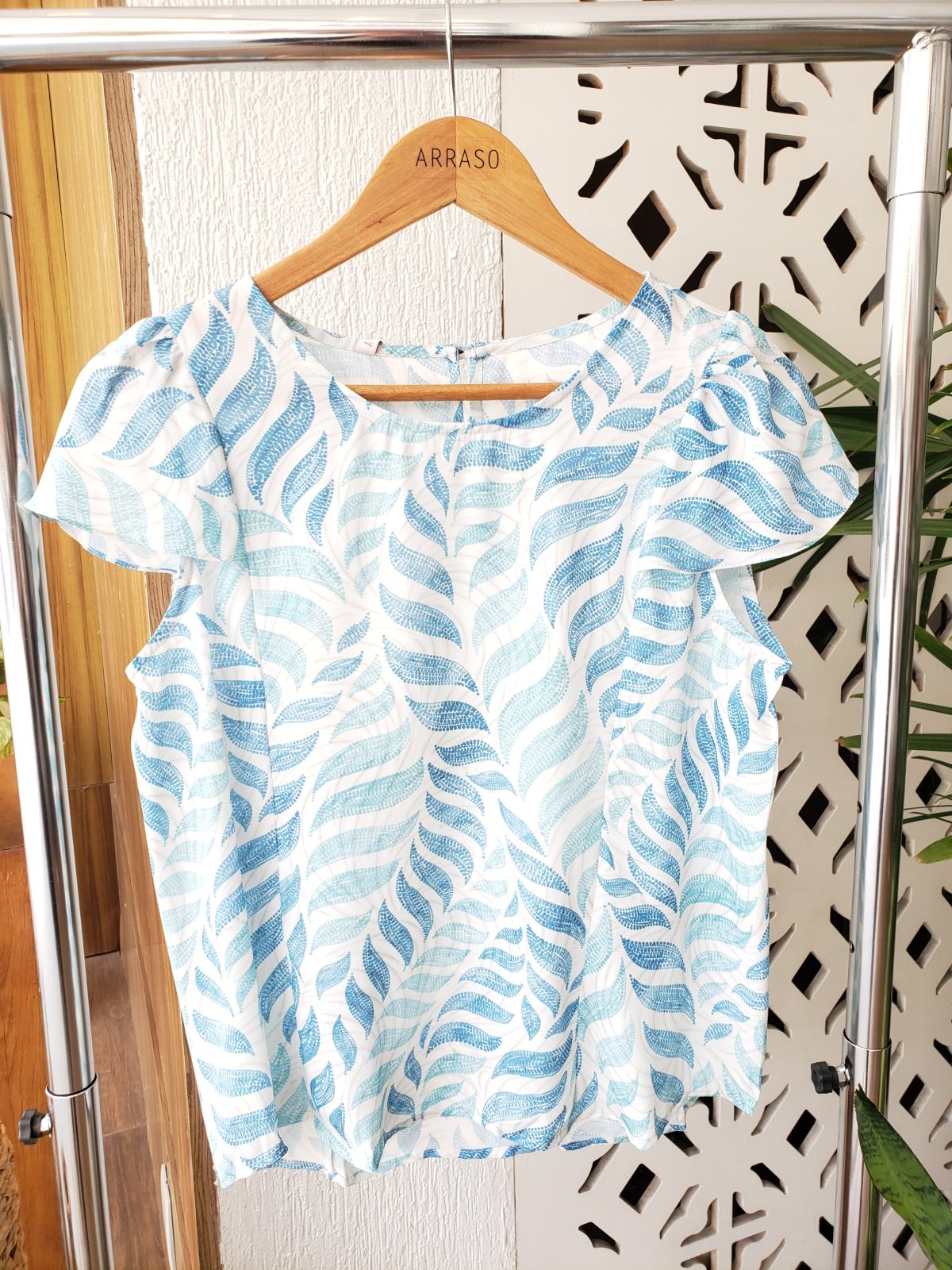 Blusa estampada fundo claro, manga curta.