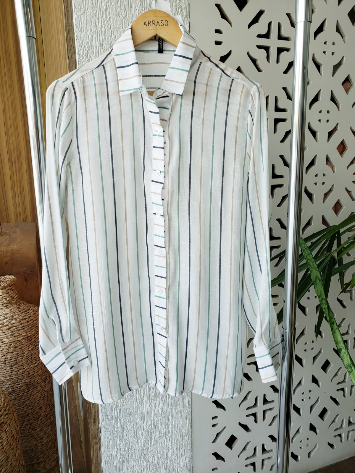 Camisa listrada, tecido leve.